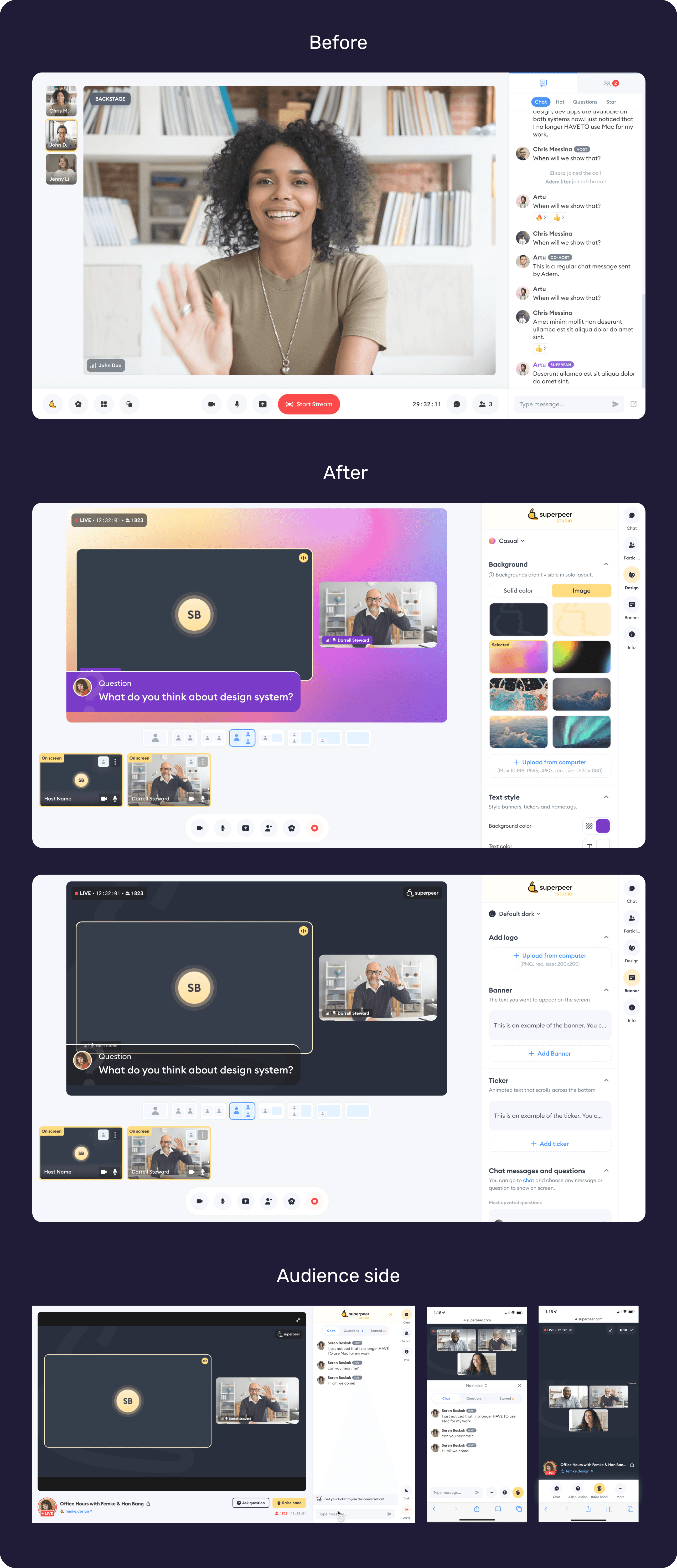 Superpeer Studio enables hosts to engage with their audiences. But limited customization made it hard for them to reflect their brand. I was tasked with exploring new features to solve this.